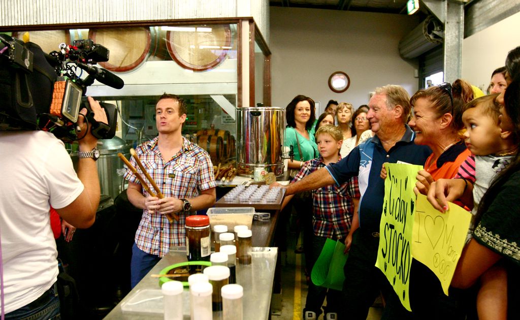 Weather presenter Grant Denyer made live crosses from the Sarina Sugar Shed to help mark Mackay's 150th anniversary.